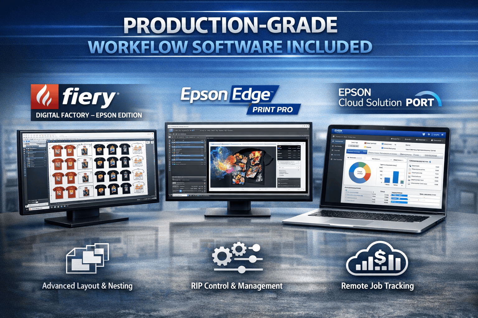 The SureColor G9070 includes Fiery® Digital Factory – Epson Edition and Epson Edge® Print Pro. It also integrates with Epson Cloud Solution PORT® for remote production monitoring, job tracking, and cost accounting.