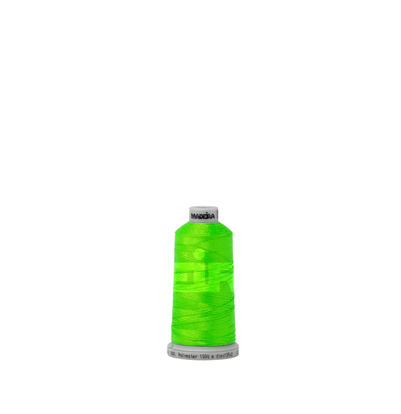 Madeira's Fluorescent Green 1850 100% polyester machine embroidery thread, Polyneon, is constructed of a specifically developed raw material, eliminating looping, puckering and virtually all thread breaks. Suitable for almost any application, Polyneon's unique formula makes this thread extremely durable and smooth running for high-speed embroidery machines. Vibrant colors are glossy, as well as resistant to chlorine bleach. Choose Madeira for the highest quality embroidery thread available.