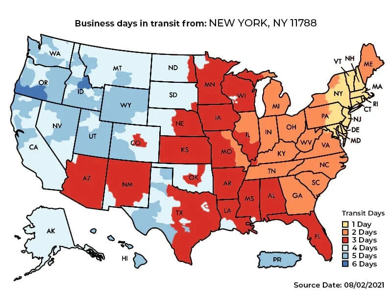 GPI only ships orders Monday through Friday (since UPS only picks up Mon thru Fri). The Service Map above is a general representation of UPS Ground transit times. The map colors may vary due to differences in hardware and software. For service availability and to calculate the delivery time for a package shipped between a specific origin and destination worldwide, select this link.